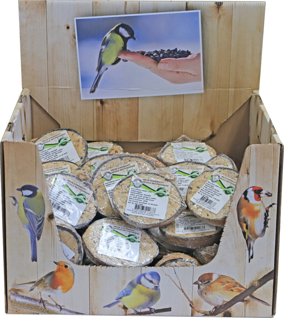 De kokosnoot 1/2 met pindakaas is voor buitenvogels een leuke afwisseling en aanvulling op hun natuurlijke menu. De halve kokosnoot is gevuld met dierlijk vet waar zaden, granen en pinda's in vermengd zitten. Makkelijk op te hangen dankzij het touwtje.