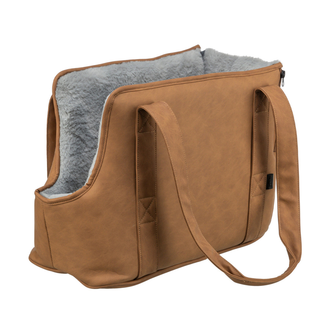 Stijlvolle, kunstleren tas om je hond in te vervoeren. Met zachte pluchen binnenkant en geïntegreerde korthouder.