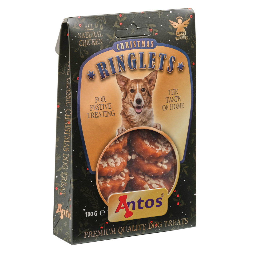 De Antos Christmas Ringlets worden exclusief met de hand gemaakt en bevatten de perfecte combinatie van kip en kaas. Geef ze rechtstreeks uit het pakje of voeg ze toe aan het kerstontbijt van je hond. Een echt feestgevoel!