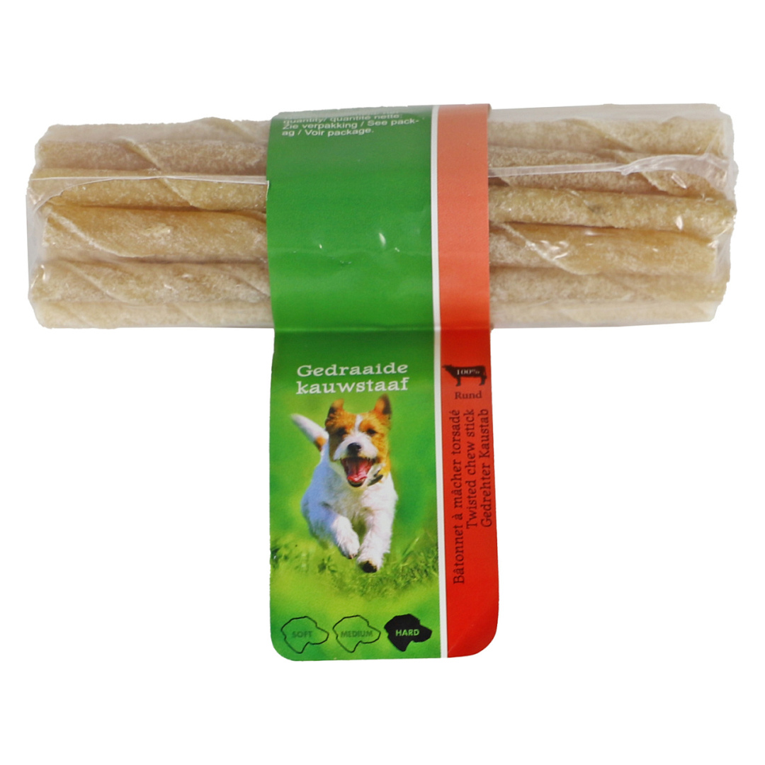 Deze kauwstaafjes van geperste runderhuid verzorgen de tanden van uw hond, sterken het tandvlees en gaan verveling van de hond tegen.