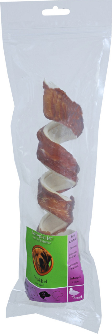 Wokkel van witte buffelhuid met eend, deze smakelijke combinatie maakt dit tot een onweerstaanbare snack voor honden. Hoge acceptatie, glutenvrij, zonder toevoegingsmiddelen en van premium kwaliteit.
