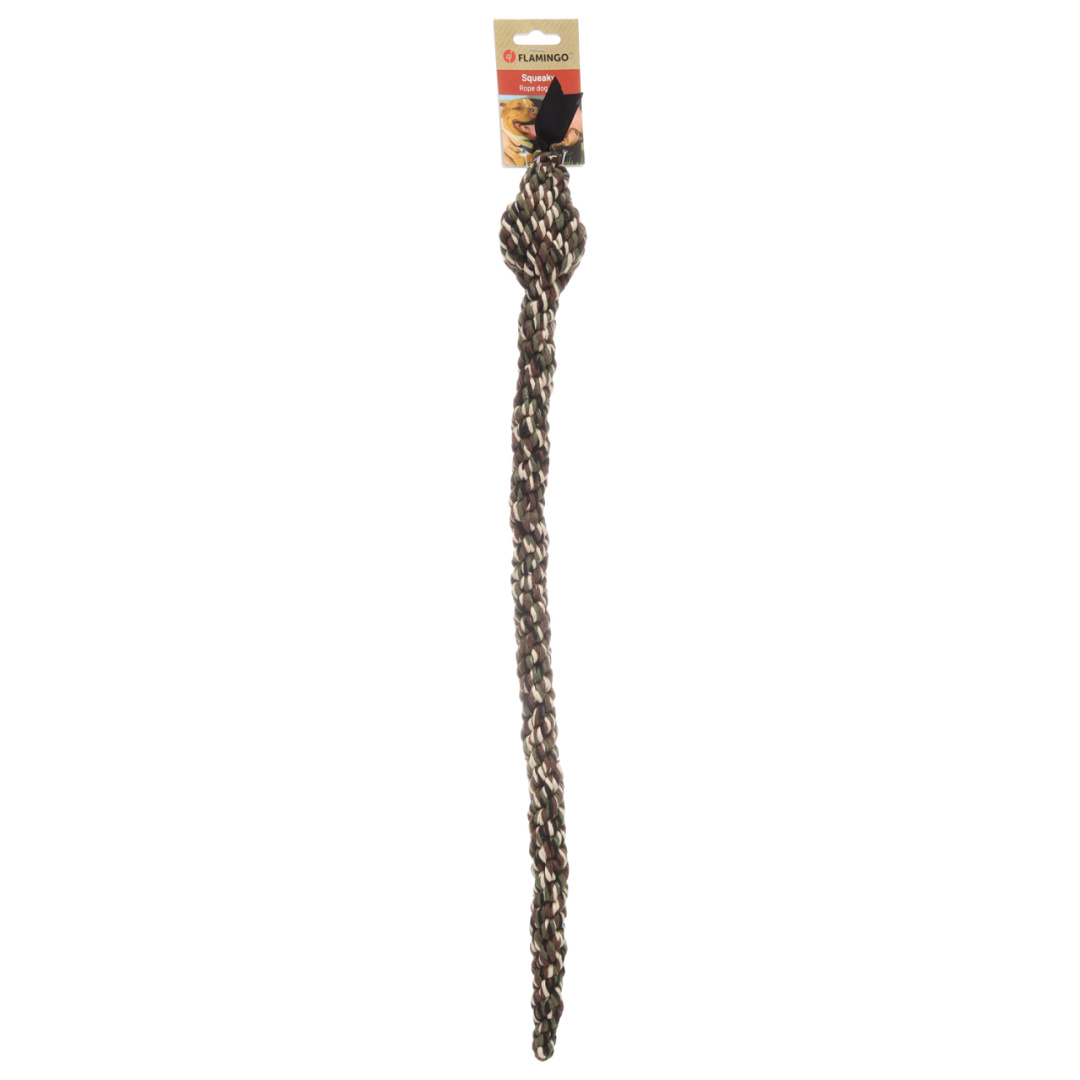 Verwen je hond met dit leuke katoenen touwspeeltje Flocco met squeaker! Niet alleen zorgt het voor extra speelplezier, maar het helpt ook om tandplak te voorkomen en het tandvlees te masseren.