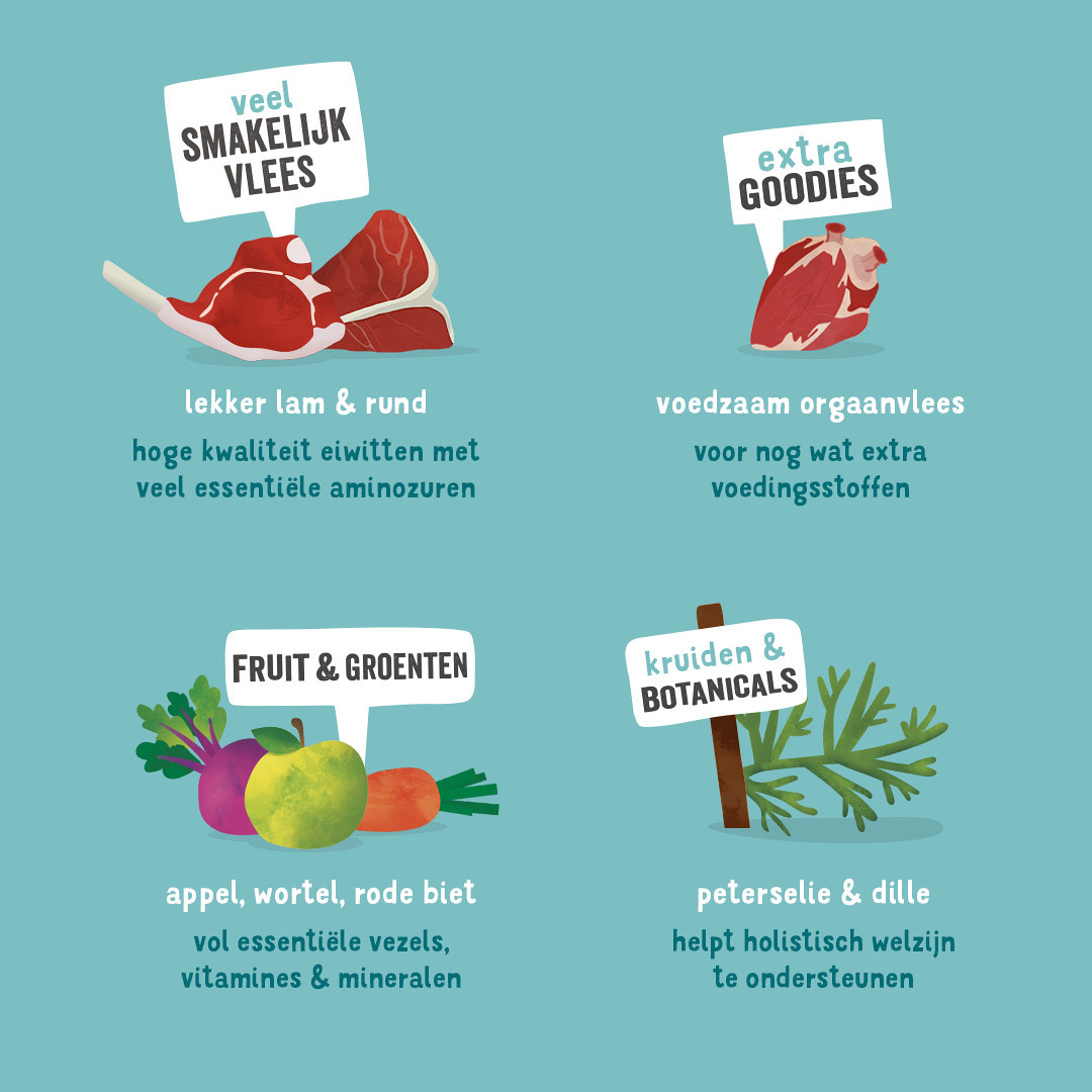 Samenstelling: lam 30%, rund 26%, mineralen, wortels 2%, broccoli 1%, rode bieten 1%, appels 1%, spinazie 1%, peterselie 0,1%, dille 0,1%.