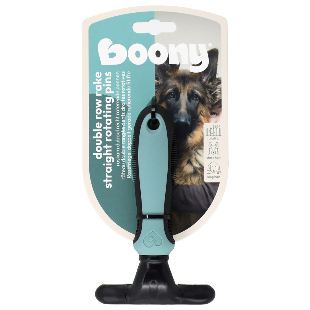 Deze Boony Roskam met dubbele roterende pennen is ideaal voor het ontklitten en ontwollen van honden met stokhaar of langharige vachtstructuren. Dankzij de dubbele rij pennen pak je in één beweging meer haar en vuil mee, wat zorgt voor een efficiënte en diepgaande verzorging van de vacht.