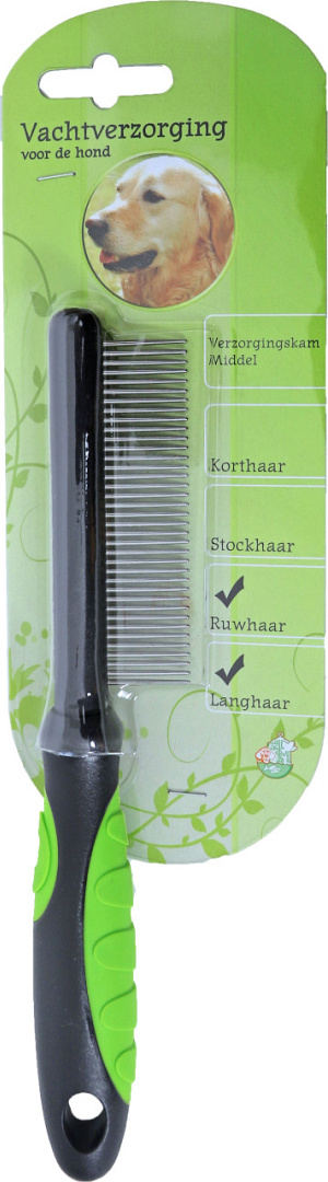 Deze kam middel met gemiddelde tandwijdte verzorgt de vacht van jouw hond door deze los te maken, op deze manier worden losse haren, vuil en eventuele klitten verwijderd. Deze verzorgingskam is geschikt voor alle honden met een dunne langharige vacht.