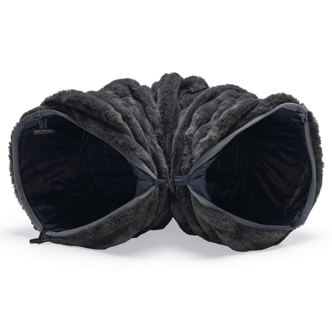 Kattentunnel van prachtige ribstof, met doorkijkgat halverwege voor extra speelplezier. Plat op te bergen.