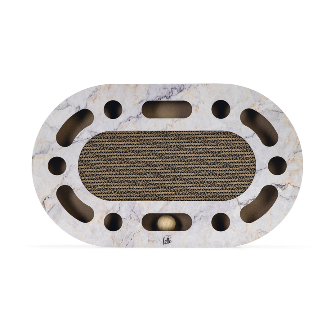 Designed by Lotte krabspeeltje Meda past perfect bij de laatste interieurtrends. Met zijn elegante kleur en marmerlook is dit krabspeelgoed niet alleen functioneel voor jouw kat, maar ook een stijlvolle toevoeging aan je woonkamer. Gemaakt van karton waar katten dol op zijn, biedt het een ideale plek om nagels te scherpen en gezond te houden. Meda is voorzien van speelballetjes en gaten in de bovenzijde, wat de natuurlijke krabbehoefte van jouw kat stimuleert en hen uitdaagt om te spelen en actief te blijven. Bovendien wordt er kattenkruid meegeleverd, wat jouw kat nog meer aantrekt tot de krabplank. Het compacte formaat maakt het gemakkelijk te plaatsen in elke ruimte zonder te veel plek in te nemen.