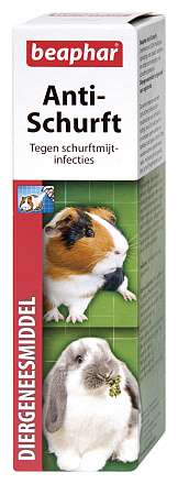 Anti-Schurft 75ml is ter bestrijding van (schurft)mijt. De eerste tekenen van een (schurft)mijt infectie zijn roodkleuring van de huid en heftige jeuk. De huid zwelt en er ontstaan open wonden en korstjes rond ogen en oren.