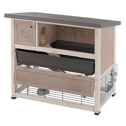 De handige, uitschuifbare lade van hygiënisch kunststof is netjes weggewerkt. Het hok heeft een aparte, veilige slaapplek.
