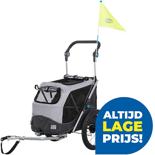 Makkelijk inklapbare hondenfietskar met een veiligheidsvlag en reflectoren. De fietskar is eenvoudig om te bouwen tot jogger. Draagvermogen tot 15, 22 of 30 kg.