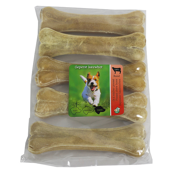 Kauwbotten uit geperste runderhuid met gebitsverzorgende werking voor de hond. Lengte 16 cm.